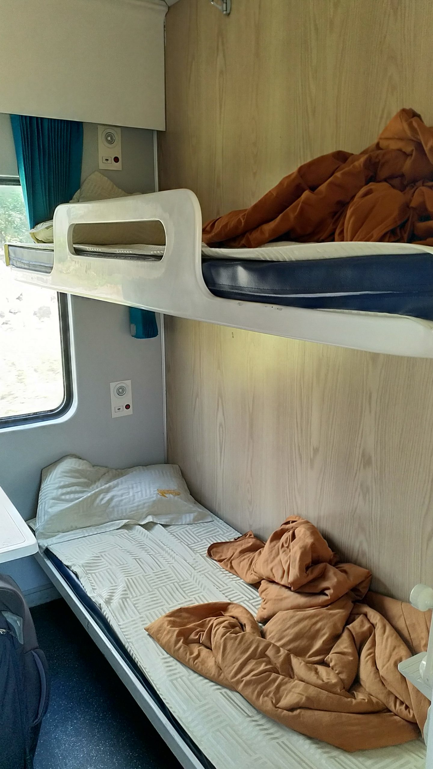 Zwei Pritschen, Marlene oben, ich unten. Das Foto entstand beim austeigen, genügend Licht. Wir sind gerädert…